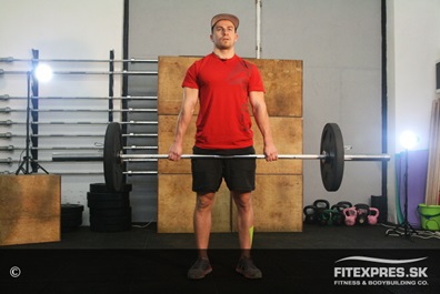 3, Kontinuálne zaberajú nohy i chrbát, pričom kolená tlačíme dozadu a mierne od tela následne, keď činka prechádza cez oblasť kolien nútime i trup k plnej extenzii . Počas prevedenia zadržíme dych a vydýchneme počas a po úplnej extenzie trupu.