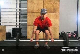 4, Následne rovnakým pohybom spúšťame záťaž s nádychom naspäť, pričom je činka stále v kontakte s telom, až kým sa zľahka dotkneme činkou zeme a znova dvíhame záťaž naspäť do úplného ukončenia počtu opakovaní / série.